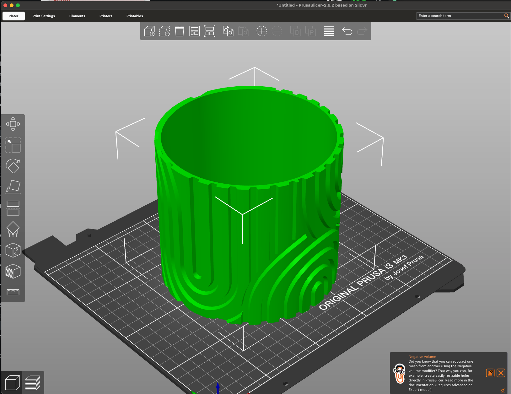 Now that the printer was accessible, I found an STL online that I liked, booted up PrusaSlicer and gave it a whirl. DIY 3D printers being what they are, the first results were a mess of bad adhesion, but luckily I had taken notes the last time I had printed and so I could run the magical command M206 Z0.4