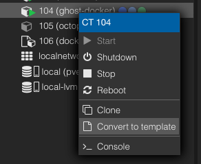 I decided to install OctoPrint using docker, and seeing as this is the third LXC that I've needed to add docker to I opted to save future Miguel some time by creating an LXC template with docker pre-installed. Proxmox makes the process very simple: you create an LXC as usual, install whatever software you like on to it, then right click and choose Convert to template